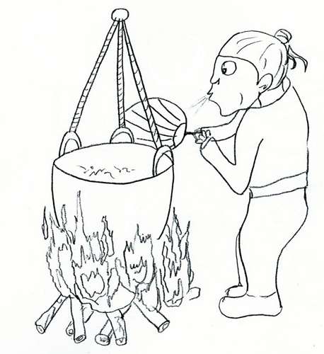 Iam antaŭe, kiam malsaĝulo dekoktis nigran sukeron por solidigi ĝin, riĉulo venis en lian domon. La malsaĝulo pensis: "Mi devas regali lin per sukera akvo." Li tuj verŝis iom da akvo en la kaldronon kaj ekboligis ĝin. Dum la boligado li senĉese ventumis la akvon per ventumilo, por ke ĝi malvarmiĝu kiel eble plej rapide. Vidinte tion, oni diris al li: "Kiel la sukera akvo povas malvarmiĝi je via ventumado, se vi ne ĉesigas la bruladon de la fajro?"