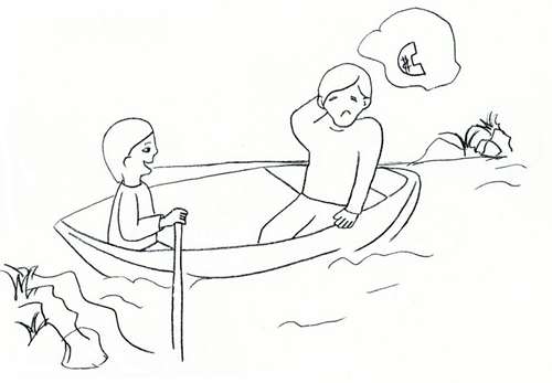Iam estis komercisto. Oni ŝuldis al li kvindek monerojn, kaj ne redonis la monon por longa tempo. Li do iris al la ŝuldanto por postuli la monon. Li renkontis riveron sur la vojo, kaj elspezis ducent monerojn por ĝin transpasi boate. Atinginte la cellokon, li ne sukcesis trovi la ŝuldanton, kaj povis fari nenion alian ol reveni hejmen. Li denove elspezis ducent monerojn pro la rivero dum sia reveno. Krome, li suferis ankaŭ de lacego pro la longa vojaĝo. Li perdis tro multe por malmulte da ŝuldo. Oni ĉiuj mokis lin pri tio.