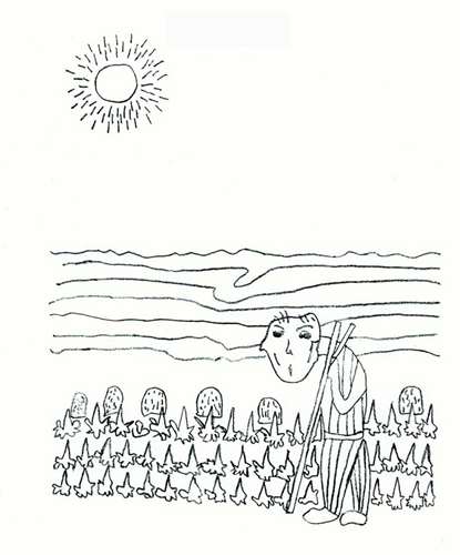 Iam estis viro, al kiu mankas saĝo. Foje, li suferis pro soifo kaj volegis trinki akvon. Kiam li vidis vaporon el la kamparo, li opiniis, ke tio estas akvo. Do li kuregis longan vojon eĉ ĝis Hindia Rivero. Atinginte la riverbordon, li nur gapis la akvon anstataŭ ektrinki. Iu demandis: "Vi serĉis akvon por trinki. Nun vi ja estas ĉe la rivero; pro kio vi ne trinkas?" La malsaĝulo respondis: "Mi trinkus, se mi povus fintrinki ĉion el la rivero; tamen estas tro multe da akvo por mi trinki, mi do trinku neniom." Aŭdinte tion, ĉiuj ekridis.