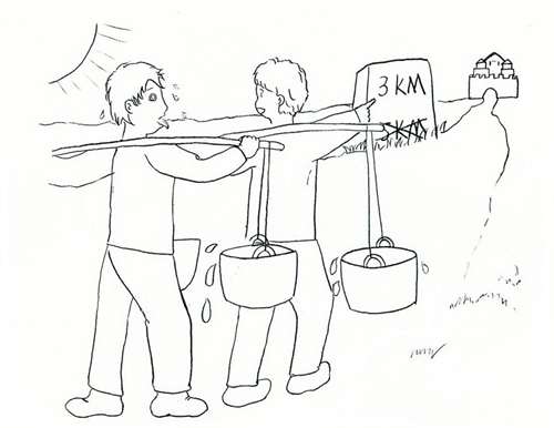 Iam antaŭe, iu vilaĝo distancis al la ĉefurbo je kvin joŝanoj*. En la vilaĝo troviĝis dolĉa fonto. La reĝo ordonis la vilaĝanojn porti dolĉan akvon ĉiutage al li. Lacigite de tio, ĉiuj vilaĝanoj volis fuĝi aliloken por sin teni malproksima de la vilaĝo. Tiam la vilaĝestro diris al ili: "Ne foriru. Mi petu la reĝon ŝanĝi la distancon de kvin joŝanoj al tri por mallongigi la vojon kaj senlacigi vin ĉiujn." Poste, li iris al la reĝo por peti la favoron. La reĝo konsentis, kaj vere ŝanĝis la kvin joŝanojn al tri. Informiĝinte pri tio, la vilaĝanoj ĝojegis. Iu alia diris al ili: "La vojo longas ankoraŭ kvin joŝanojn, kaj neniom malplilongiĝis." Sed neniu el la vilaĝanoj volis forfuĝi plue pro kredo al la reĝo, malgraŭ la vero.