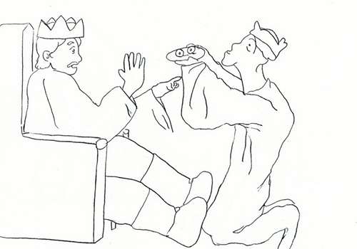Malsaĝa subulo tuj iris al la feo, elprenis liajn okulojn kaj portis ilin al la reĝo. Li raportis: "Mi jam elprenis liajn okulojn, do li neniel povos iri al aliaj lokoj, sed porĉiam restos en nia regno." La reĝo riproĉis lin: "Mi volas restigi la feon en nia regno nur pro tio, ke li povas vidi ĉiajn trezorojn sub la tero. Nun vi jam difektis lian vidpovon, do per kio li estos ankoraŭ utila al mi?"