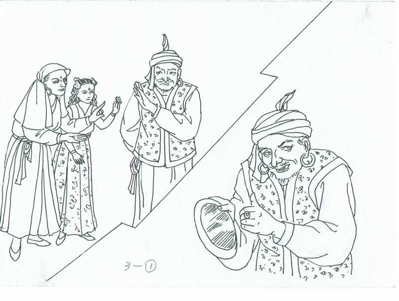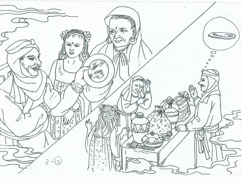 Iutage, kiam unu el la komercistoj faris komercon sur strato de sia parto, malriĉa knabineto vidis lin kaj petis sian avinon aĉeti por ŝi braceleton. La maljuna avino respondis: "Kiel ni malriĉulinoj povus aĉeti braceletojn?" La knabineto diris: "Ni havas neniom da mono, tamen ni povas doni al li nian malnovan teleron nigre fumumitan." La maljunulino konsentis provi, do ŝi invitis la vendiston en sian hejmon.