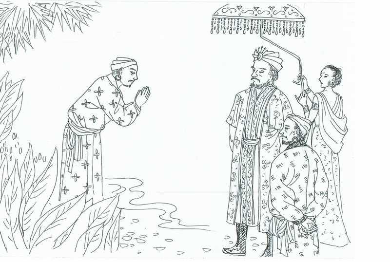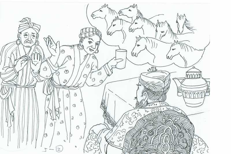 Ĉiuj ministroj kaj korteganoj kolektiĝis en la kortega kunvenejo. La komercisto de ĉevaloj diris al la reĝo: "Via Reĝa Moŝto, mi komprenas, ke en via lando miaj kvincent ĉevaloj valoras nur tason da rizo. Antaŭ la forlaso el via lando, mi volas scii pri valoro de taso da rizo." La reĝo sin turnis al la prezisto kaj diris: "Kio estas la valoro de taso da rizo en nia lando?"