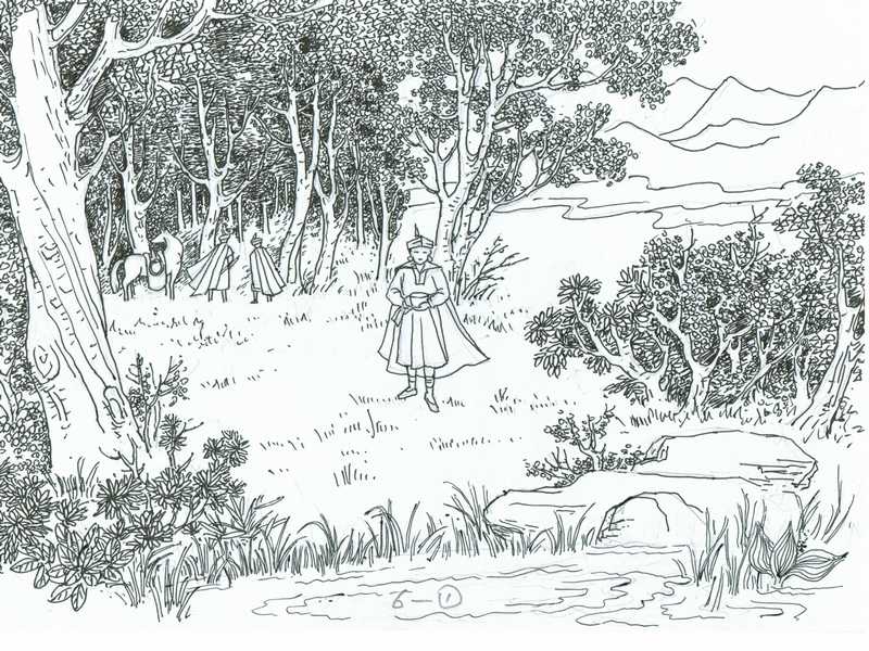 Ambaŭ fratoj ne plu revenis, do Reĝido Elokventulo maltrankviliĝis kaj pensis, ke ili estas en danĝero. Li mem iris al la bela malhele blua lago. Estante saĝa kaj atentema, li ne iris rekte en la akvon. Anstataŭe, li esploris kaj vidis du liniojn da piedsignoj direktantaj al la lago senrevene. Por sin protekti, li pretigis siajn glavon, pafarkon kaj sagojn. Li komencis iri ĉirkaŭ la lago.