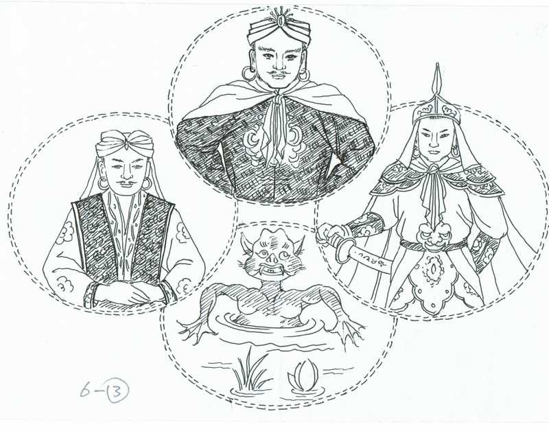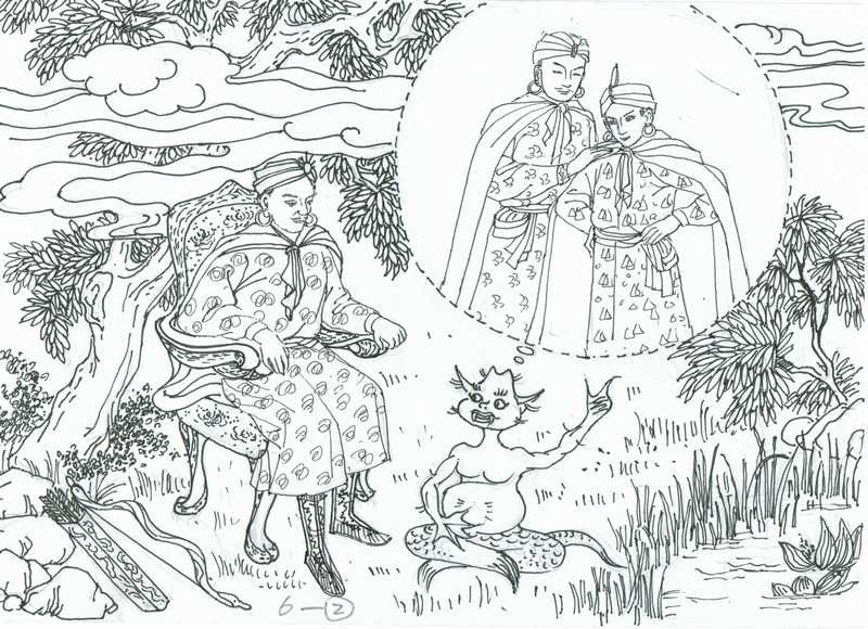 Vidinte, ke tiu ĉi reĝido ne rekte iris en la lagon, la akva demono sin ŝanĝis en humilan vilaĝanon kaj diris al la reĝido: "Vi estas laca kaj soifa de longa irado, mia kara amiko. Kial vi ne iru en la akvon por lavi vin, trinki akvon kaj manĝi lotusajn radikojn?"