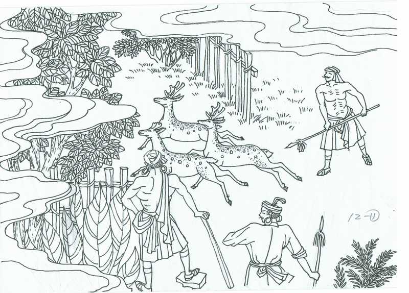 Do la popolanoj konstruis la cervan parkon. Ili faris lagetojn por ke cervoj trinku akvon, kaj plantis arbojn kaj herbojn por ke cervoj manĝu. Kiam ĉio estis preta, ili malfermis la pordon kaj iris en la proksiman arbaron. Ili ĉirkaŭis la tutajn arojn de Banjana kaj Branĉa Cervoj. Poste per bastonoj, armiloj kaj bruigiloj, ili pelis ĉiujn cervojn en la cervan parkon kaj fermis la pordon post ili.