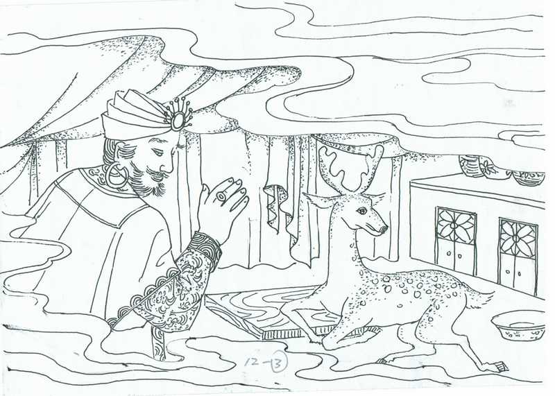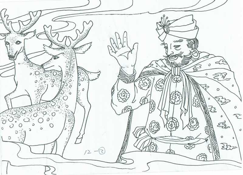 La reĝo iris en la novan cervan parkon. Tie li ĝojplene vidis grandan aron da cervoj. Rigardante ilin, li subite trovis du ĉarmajn orkolorajn cervojn kun plenkreskintaj kornoj. Li admiris ilian raran belecon, kaj tuj faris proklamon por protekti ambaŭ orajn cervojn. Li ordonis, ke oni tenu ilin tute sekuraj, kaj neniu rajtu damaĝi aŭ mortigi ilin.