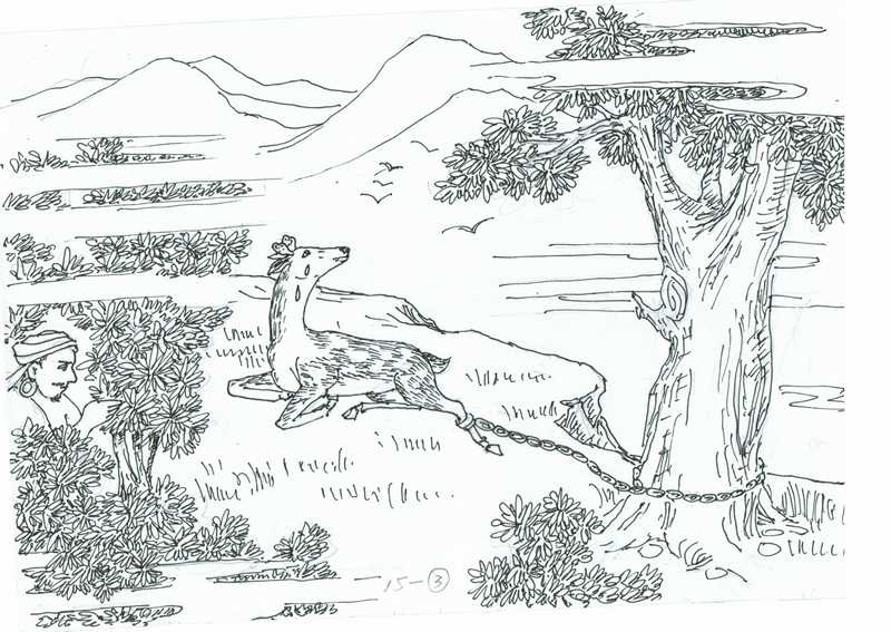 Iutage la mallernema cervido malfeliĉe trafis ŝnurkaptilon kaj estis kaptita. Lia patrino maltrankviliĝis pro lia perdiĝo. Ŝi iris al la instruisto kaj demandis: "Kara fraĉjo, kio estas la situacio de mia filo? Ĉu vi vere instruis vian nevon pri la artifikoj de cervoj?"
