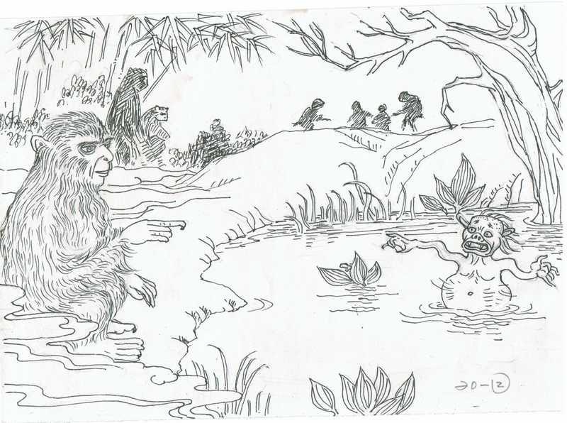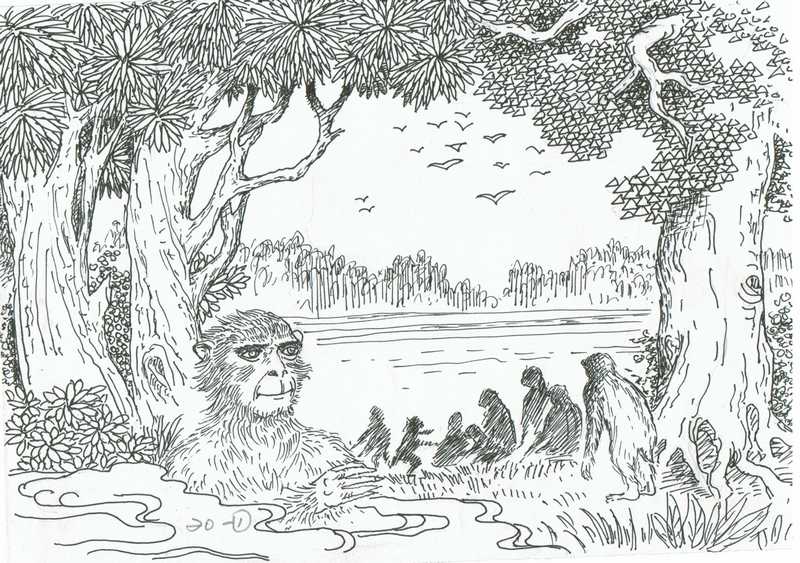 Post nelonge, la akva demono vidis, ke neniu el la simioj iris en la akvon por trinki. Do en formo de timiga monstro li sin montris el la mezo de la lageto. Li havis grandan bluan ventron, ruĝajn ungegojn kaj piedojn, kaj blankan vizaĝon kun elstaraj verdaj okuloj. Li diris: "Kial vi nur sidas ĉirkaŭe? Tuj venu en la lageton kaj trinku akvon."