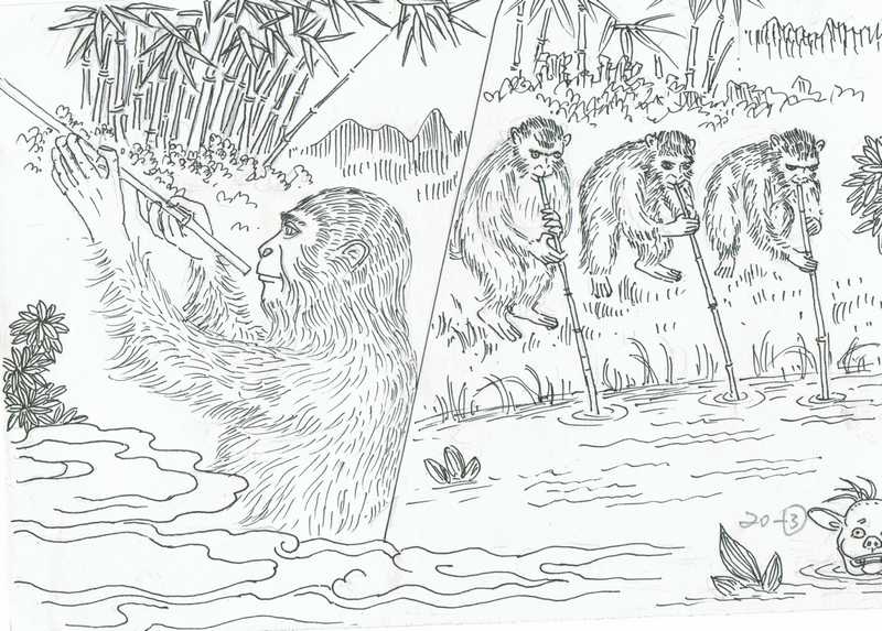 Kompreneble, ĉiuj, kiuj vidis bambuon, scias bone, ke estas malfacile trinki per bambueto. Bambuoj kreskas ŝalmo-post-ŝalme kaj inter du ŝalmoj estas nodo. Se simioj uzas unu ŝalmon por trinki akvon, la tubo estas tiel mallonga, ke la demono povas kapti ilin, treni ilin sub la akvon kaj engluti ilin. Sed pro la nodoj, estas neeble suĉi akvon tra pli ol unu ŝalmo.