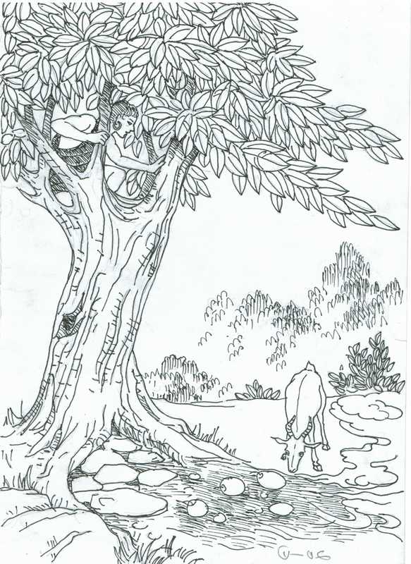 Frumatene la antilopo venis al la plej plaĉa arbo por serĉi fruktojn. Ĝi tute ne vidis la ĉasiston kaŝiĝantan sur la arbo kun maŝo pretigita. La antilopo estis singardema malgraŭ malsatego. Ĝi atentis pri la eventuala danĝero. Ĝi vidis la bongustajn kaj maturajn fruktojn sub la plej plaĉa arbo kaj pensis, kial neniu el ili estis manĝita de bestoj. Do ĝi timis, ke en tio estas ia intrigo.