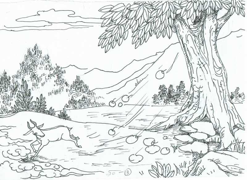 Sed la antilopo estis tre saĝa. Ĝi sciis, ke la fruktoj nur falis de la arboj vertikale. Ĝi ekkonsciis, ke estas danĝero, ĉar la fruktoj flugis al ĝi. Ĝi do atente esploris la arbon, kaj vidis la ĉasiston inter la branĉoj. Sed ĝi ŝajnigis ne vidi lin.