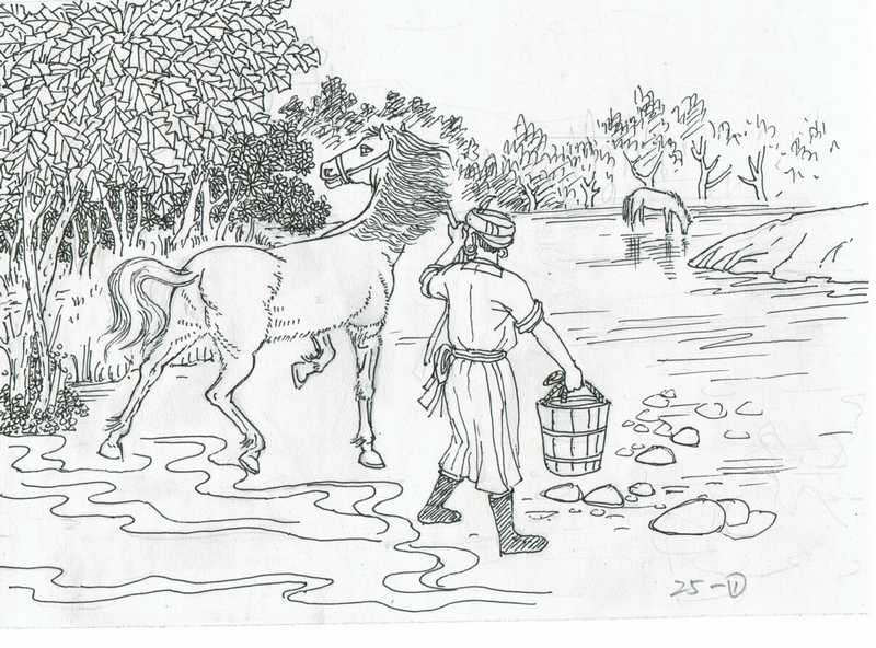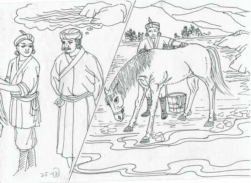 Iam antaŭe en regno de Hindio, oni kutime kondukis la plej bonan el la kortegaj ĉevaloj al la rivero por ĝin bani. Foje, la ĉevalistoj kondukis ĝin al sama malprofunda lageto, kie ili ĉiam ĝin banis.