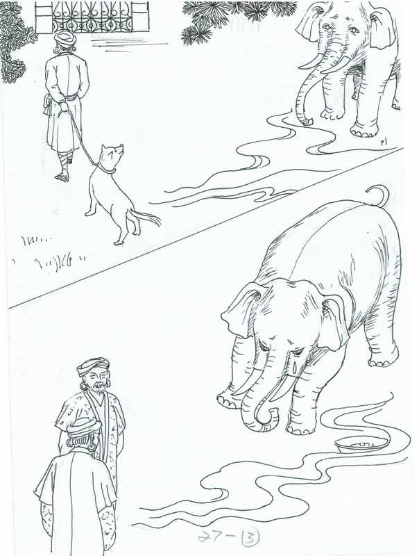 Iam estis reĝa elefanto bone bredita kaj prizorgita. Najbare de la elefantejo vivis migra hundo osteca pro malsato. Altirita de bonodoro el la dolĉa rizaĵo por la elefanto, ĝi ekglitadis en la elefantejon por manĝi la bongustajn rizerojn falintajn el la elefanta buŝo. Ĝi tiel ŝatis la mangaĵon, ke post nelonge ĝi ne plu volis manĝi en alia loko. Dum ĝuado de la manĝaĵo, la granda elefanto ne rimarkis la migran hundon timeman kaj honteman.