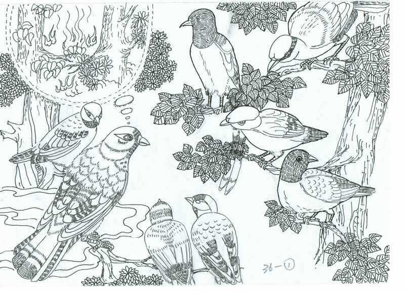 Do la saĝa maljuna birdo kunvenigis ĉiujn birdojn vivantajn en (sur) la giganta arbo. Li sincere avertis al ili: "Miaj karaj amikoj, brulos la arbo, en (sur) kiu ni vivas. La fajro detruos la tutan arbaron. Do estos danĝere resti ĉi tie. Ni forlasu la arbaron senprokraste!"