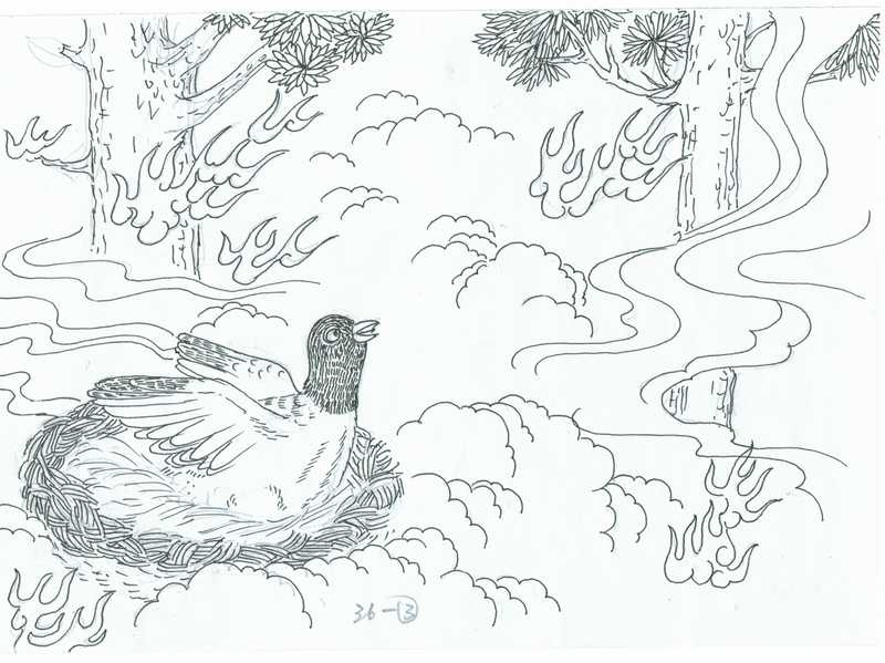 Post nelonge, vere okazis fatalaĵo kiel averto de (avertis) la saĝa gvidanto. La reciproke frotantaj branĉoj estigis fajreron, kiu falis en sekajn foliojn sub la arbo. La fajreroj fariĝis fajro pli kaj pli granda. Post nelonge, la giganta arbo ekbrulis. La restantaj malsaĝaj birdoj blindiĝis kaj sufokiĝis en fumo. Multaj ne eskapintaj birdoj pereis en la fajro.