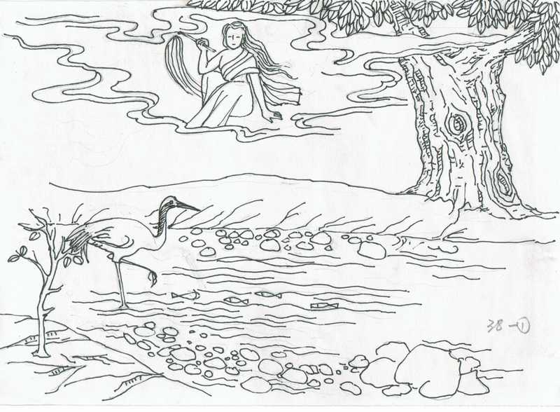 La gruo mallevis la kapon kaj prenis la malgrandan fiŝon per sia beko. Li etendis la flugilojn kaj flugis al granda arbo sur la bordo de la bela lago. Ĝuste kiel li diris, la lago estis kovrita de belaj lotusfloroj. La fiŝo surpriziĝis de tiel bela loko. Poste, la gruo reportis lin al la malgranda lago laŭ la promeso.