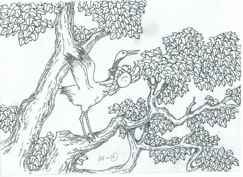 La gruo diris: "Kiun vi nomas stulta? Mi ne akceptos tion de vi. Vi ne estas mia parenco. Mi supozas, ke vi volas trompi min por senpaga vojaĝo. Sed mi estas saĝulo. Nur rigardu la fiŝostojn sub la arbo. Mi jam elmanĝis ĉiujn fiŝojn. Nun mi manĝos ankaŭ vin, stultan krabon!"
