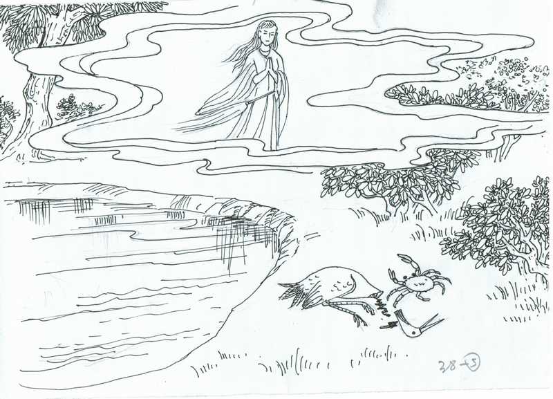 Sed la maljuna krabo jam estis ĉe la bordo. Li konsciis, ke la gruo estas ne fidinda, kion ajn li diris. Li sciis, ke se li ellasos la gruon, tiu certe manĝos lin. Do li tranĉis lian kolon per siaj pinĉiloj kvazaŭ li tranĉus buteron. La kapo de la gruo falis sur la teron kaj tiam la krabo rampis sekure en la belegan lagon.
