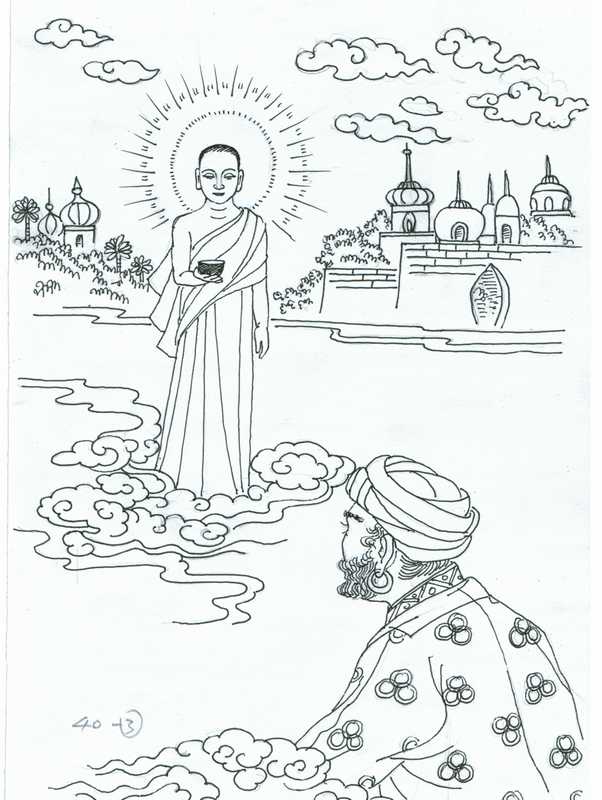 Meditante en la arbaro, Silenta Budho sin dronis en altegan animstaton. Li tiel profundiĝis en la meditado, ke li sidis senmove dum sep tagoj kaj noktoj sen manĝi kaj trinki.