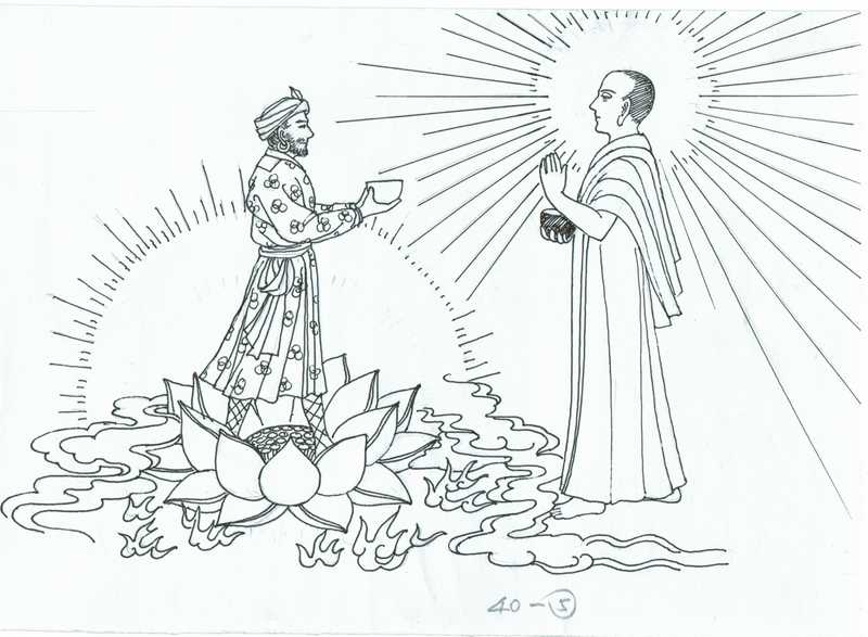 Starante sur la mirinda lotusfloro brilanta en orkoloro, la malavara mastro instruis siajn subulojn, ke ili povas purigi sian menson per praktikado de la kvin trejnaj ŝtupoj, kaj per la pura menso ili povas gajni grandan meriton en almozdono. Tio estas vera donaco de homa vivo.