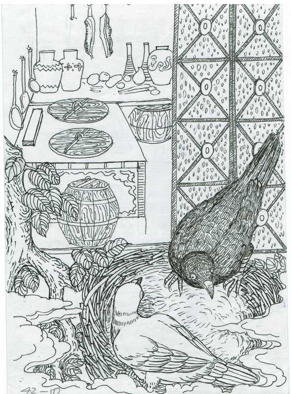 Li kaptis lin kaj eltiris ĉiujn liajn plumojn. La kompatinda korvo aspektis tre komike sen brile nigraj plumoj. Poste, la venĝema kuiristo faris spicaĵon el zingibro, salo, kapsiketo kaj pipro, kaj ŝmiris ĝin sur la dolorantan haŭton rozkoloran de la korvo. Poste li metis la birdon sur la plankon de la kolombejo kaj ridaĉis senĉese.