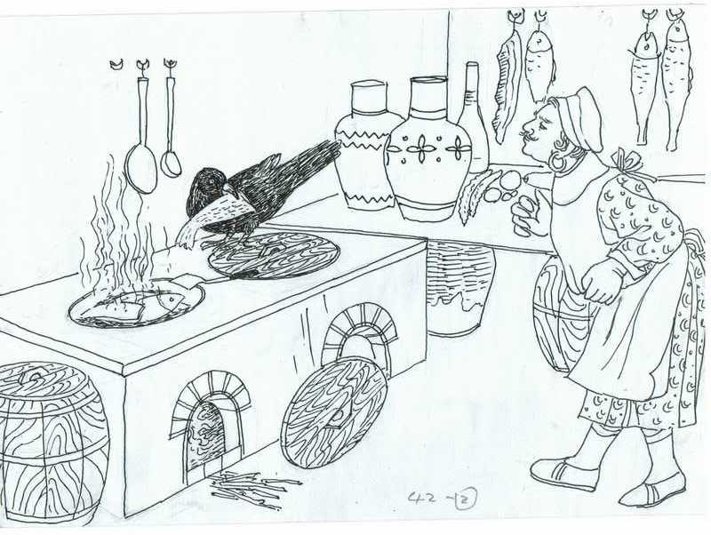 Samtempe la kuiristo preparis la viandon kaj fiŝaĵon en granda kuirpoto. Li fojfoje levetis la kovrilon por ellasi vaporon dum la kuirado. La korvo flaris la bongustan odoron de la leviĝanta vaporo. Rigardante de la kolombejo, li vidis, ke la kuiristo eliris por eviti varmecon.