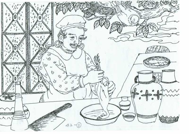 Iun tagon poste, la kuiristo preparis multajn specojn da viandoj kaj fiŝaĵoj por festeno. Li pendigis ilin sur la hokojn en la kuirejo por konservi.