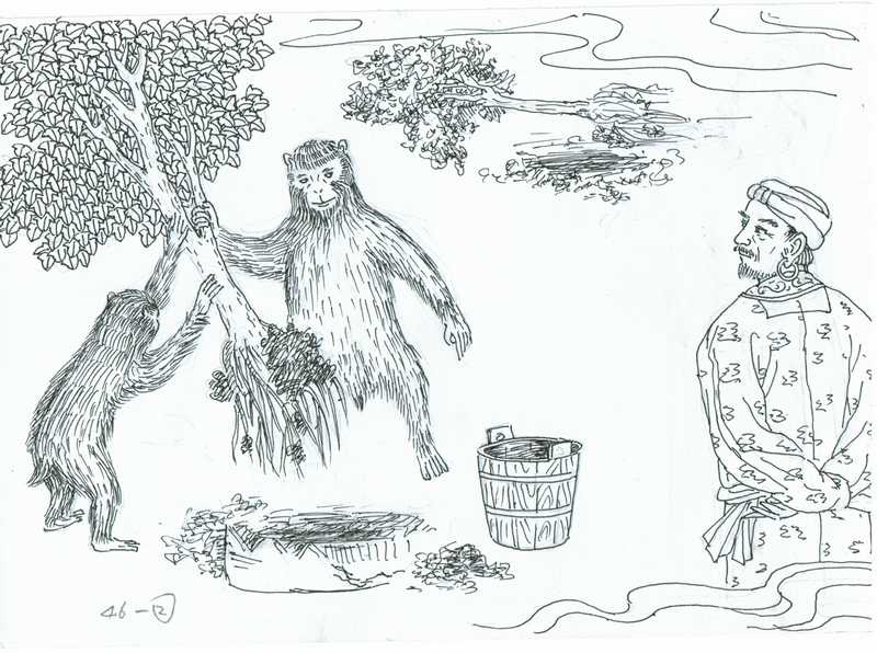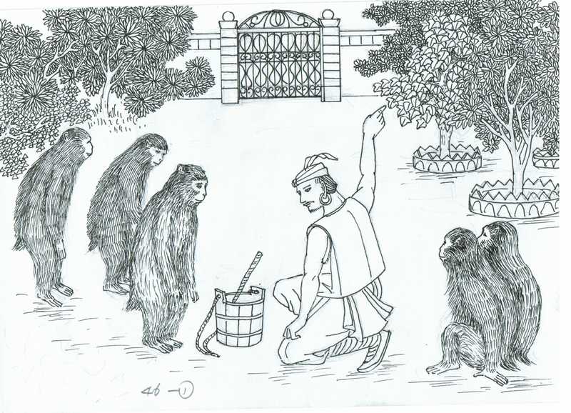 Ĝuste tiam saĝa homo ekstere preteriris la enirejon de la ĝardeno. Vidinte, ke la simioj elradikigas la junajn arbojn kaj plantojn, mezuras la radikojn kaj zorgeme verŝas akvon en la kavojn sur la tero, li demandis: "Kion vi faras en la bela ĝardeno de la reĝo laŭ via opinio, stultaj simioj?"