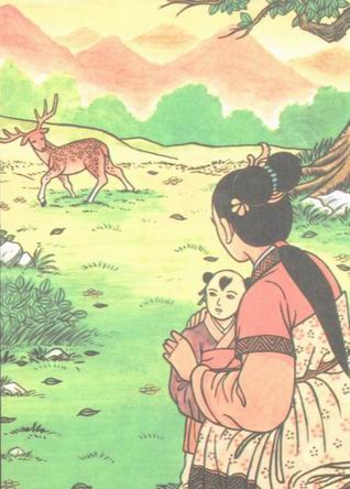 La suno brilis en la blua ĉielo. En la korto de la domo ludis knabeto. Subite entrudiĝis cervo. Ĝi hokis la knabeton je la vestaĵo per korno kaj forkuris. Timigita, la knabeto ploregis plengorĝe. Aŭdinte tion, lia patrino elkuris por vidi, kio okazas. Ŝi vidis, ke cervo kuras al la montaro portante ŝian infanon.