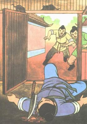 La najbaroj alkuris tien por vidi, kio okazas. Ili vidis, ke Granda Ŝju, la buĉisto de bovoj, kuŝas en sango. Sango fluadis el lia buŝo. Lia lango estis detranĉita, kaj li kuŝis morta. La najbaroj babile ekesploris pri la kaŭzo de lia neatendita katastrofo.