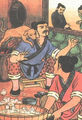 En la malantaŭo de sia gastejo, Cao Ŝengjŭan metis mortigitan hundon en poton por kuiri. Li mortigadis hundojn dum multaj jaroj, kaj fine, la hundaĵservo en lia gastejo prosperis. Li eĉ dungis du virojn por lin helpi.