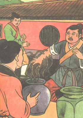 Sed la afero iris malsame tiutage. Kiam li etendis sian brakon en la urnon, lia vizaĝo subite perdis la ordinaran koloron, kaj li ekblekis kiel vundita bovo. Ĉiuj rigardis al li, kaj ili vidis, ke ĉiuj angiloj en la urno atakas lian brakon, kaj mordas lin laŭeble perforte.
