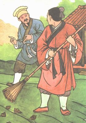 La feo diris: "Via Honora Avo, Han Jongĉun, estis malriĉa. Kvankam li ne havis sufiĉan monon por vivteni la familion, tamen li ŝatis liberigi bestojn. Ĉiumatene, kiam la suno leviĝis, li iris al rojo ĉe la domo kun balailo. Vi scias, ke 'Spiralaj Leonoj', kiel tiuj helikoj alinomataj, vagis el la rojo nokte. Via avo balais ilin kaj remetis ilin en la rojon, kie ili estis sendanĝeraj kaj neniu el la homoj povus treti ilin pro malatento. Iam li estis tiel malriĉa ke li havis neniom por manĝi, li do balais laŭ la rojo kilometrojn por forgesi la malsaton. Tiel li savis milojn kaj milojn da 'spiralaj leonoj'.
