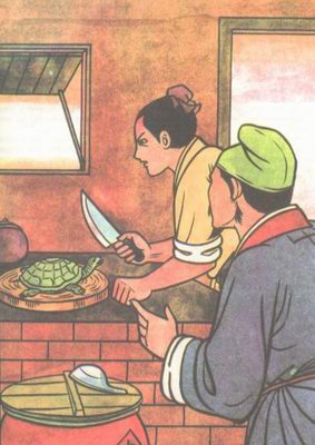 "Tiuspeca testudo estas tre malfacile aĉetebla. Kaj ĝia viando estas vere bongusta. Mastro Ŭu certe ĝojos pri tio." La kuiristo ridis de ĝojo kiam li akrigis la tranĉilon por mortigi la testudon. Sed kiam li pretis ekhaki ĝian kapon, li vidis, ke la testudo estas ploranta. Ŝajnis, ke ĝi ploras por peti lin ŝpari ĝian vivon.