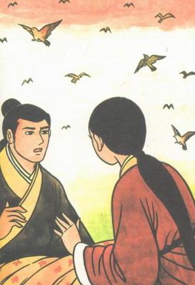 "Se vi vere amas min," ŝi daŭrigis, "Faru tion, kion mi petas. Malfermu la kaĝon kaj elliberigu ĉiujn paserojn. Tiel, eĉ se mi mortos, mi mortos en paco." Kion li povis fari? Fan do portis la kaĝon en la arbaron kaj ellasis ĉiujn paserojn. Ili flugis en arbustojn kaj arbojn kantante kaj pepante. Ili estis feliĉaj de la liberiĝo.