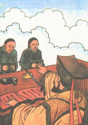 "Genuiĝu, aĉulo!" hurlis la intendantoj. Ĝin Ĝi genuiĝis, kaj rimarkis, ke iu alia ankaŭ genuas ĉe li. Tiam li konsciis, ke li konas lin. -- Li estis neniu alia ol lia amiko Li Pi, la loka buĉisto.