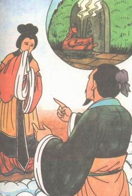 "Vi buĉis kokon ĉe mia tombo kiam vi reedziniĝis! Mi ĝojas pri via reedziniĝo. Mi ne volas vin suferi de soleco, sed pro kio vi faris la malbonaĵon kontraŭ la koko? Ĉu vi ne scias kiel serioza tio estas?"